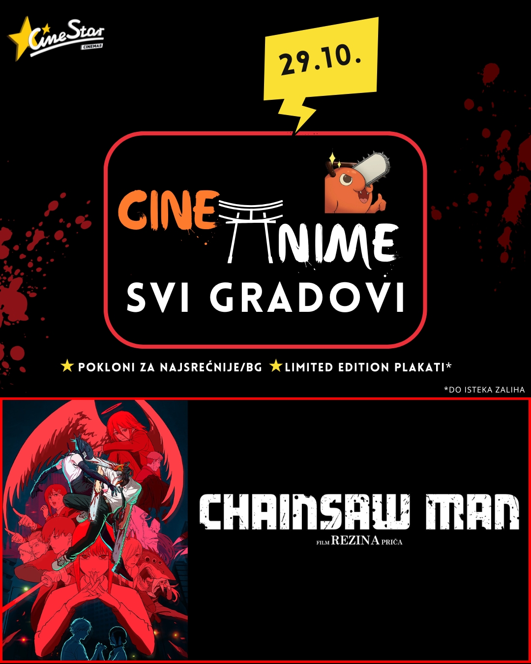 Najveći anime događaj očekuje publiku u CineStar bioskopima u Beogradu, Novom Sadu, Pančevu i Zrenjaninu – CineAnime 29.10.2025 uz pretpremijeru ostvarenja „Čovek – Motorna testera – Film Reze Arka” (Chainsaw Man).