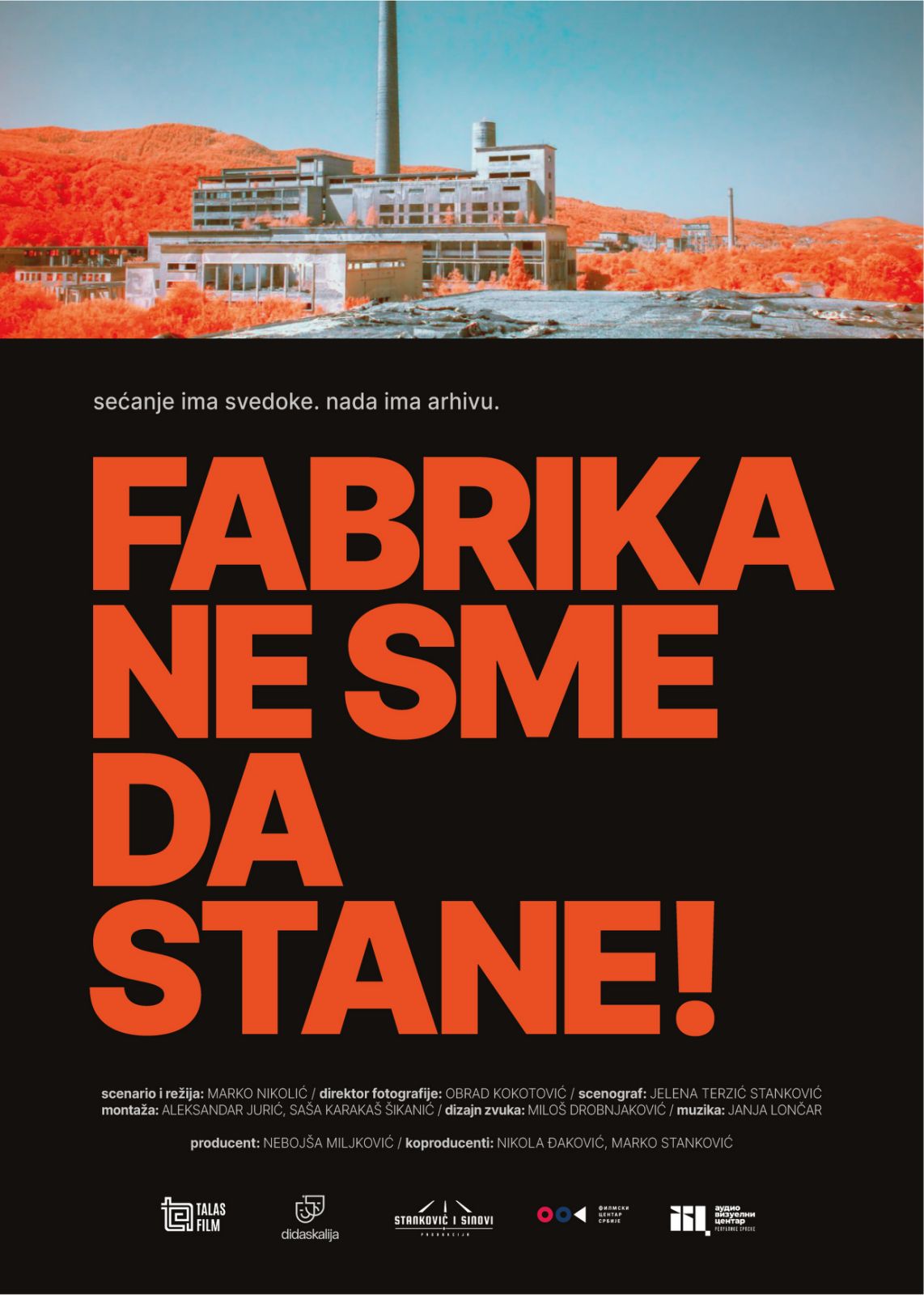 Ovaj maj doneće nam i premijeru dugometražnog dokumentarnog filma „Fabrika ne sme da stane“ autora Marka Nikolića. U pitanju je 80 minuta dugo dokumentarno ostvarenje nastalo kao koprodukcija Srbije i Bosne i Hercegovine.