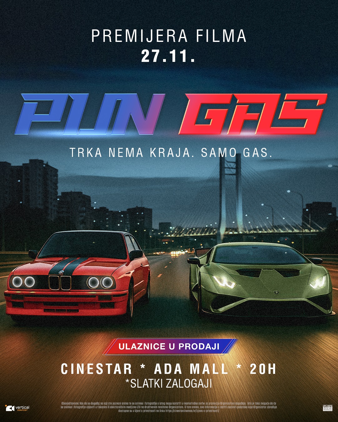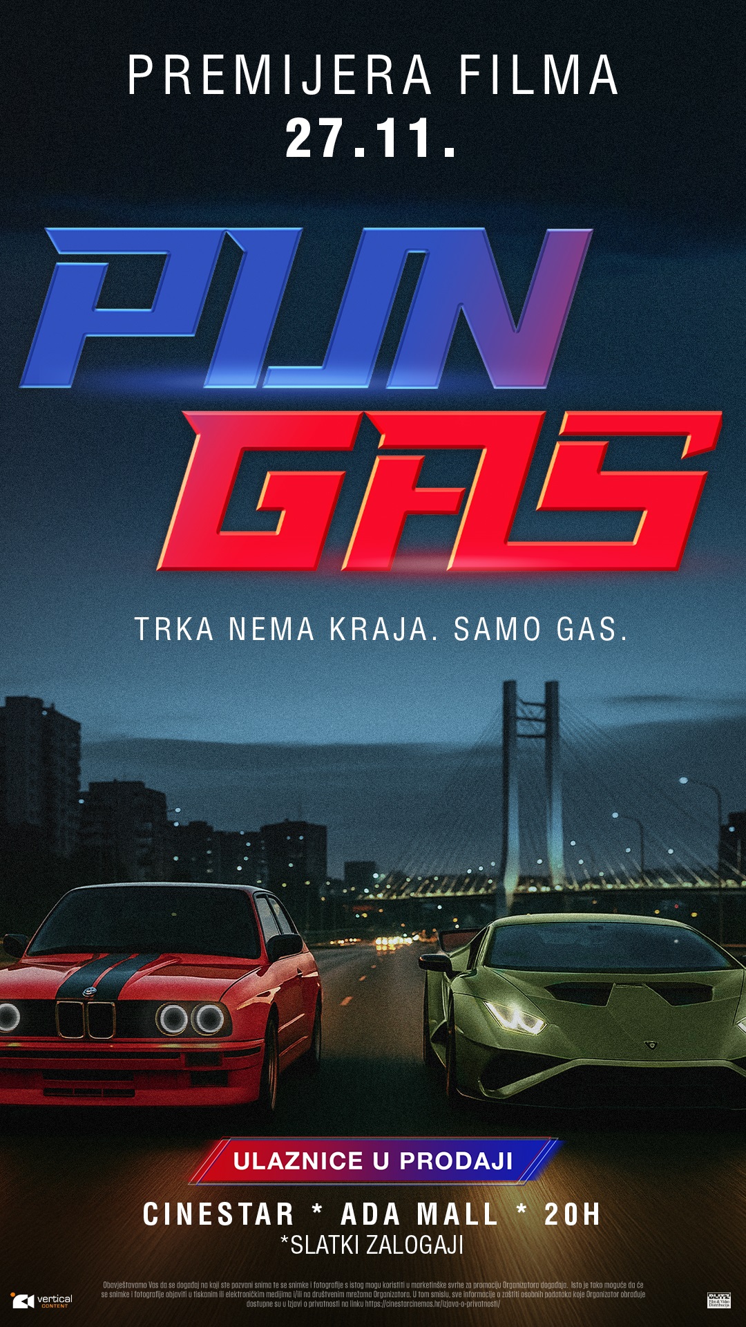 Iz bioskopskog lanca Cinestar javljajuj sledeće – Prava poslastica za ljubitelje dobrih akcionih filmova i brzih automobila, film evropske produkcije „Pun gas” prikazuje se premijerno 27.11.2025. u CineStar bioskopu u Beogradu (Ada Mall) u 4DX formatu koji omogućuje potpuni doživljaj automobilske trke i velike brzine, skoro kao da se gledaoci lično voze u brzim automobilima. Publika će uživati u slatkim zalogajima, a  tjunirani automobili poboljšanih performansi moći će da se vide na parkingu koji se nalazi na nivou CineStar bioskopa.