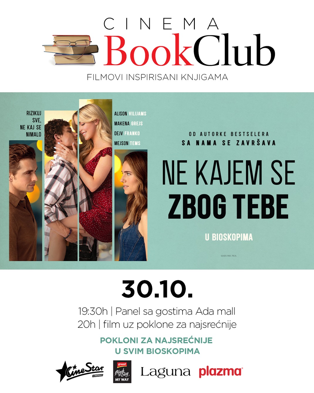 Za sve ljubitelje književnosti i filma organizuje se novi Cinema Book Club događaj u CineStar bioskopima u Srbiji (Beograd, Novi Sad, Zrenjanin, Pančevo) u četvrtak, 30. oktobra 2025. od 20 časova, kada će biti prikazan film snimljen po bestseleru, „Ne kajem se zbog tebe“. U Beogradu će pre početka filma, od 19.:0, biti održati panel sa gostima na temu fenomena ove knjige koja je postala pravi hit na mreži Tik Tok. Pripremljeni su i pokloni u svim bioskopima za najsrećnije posetioce, koje su pripremili atraktivni partneri (Laguna, Grand Black’n’Easy i Plazma).